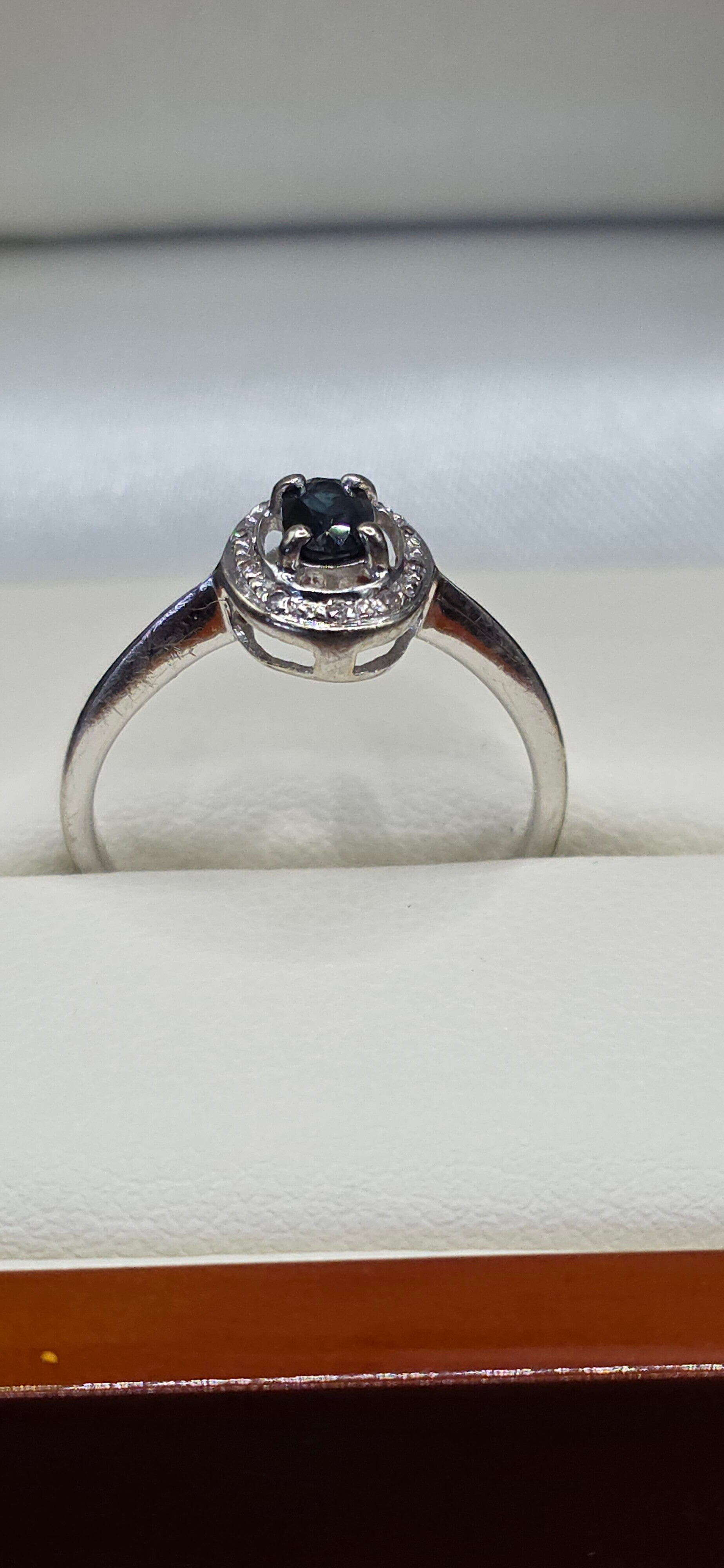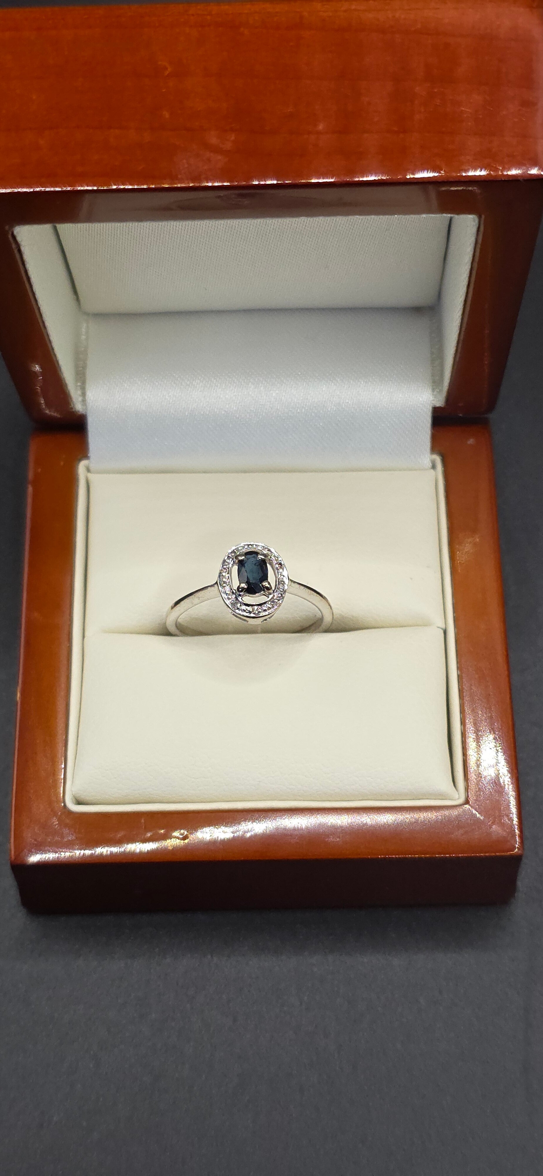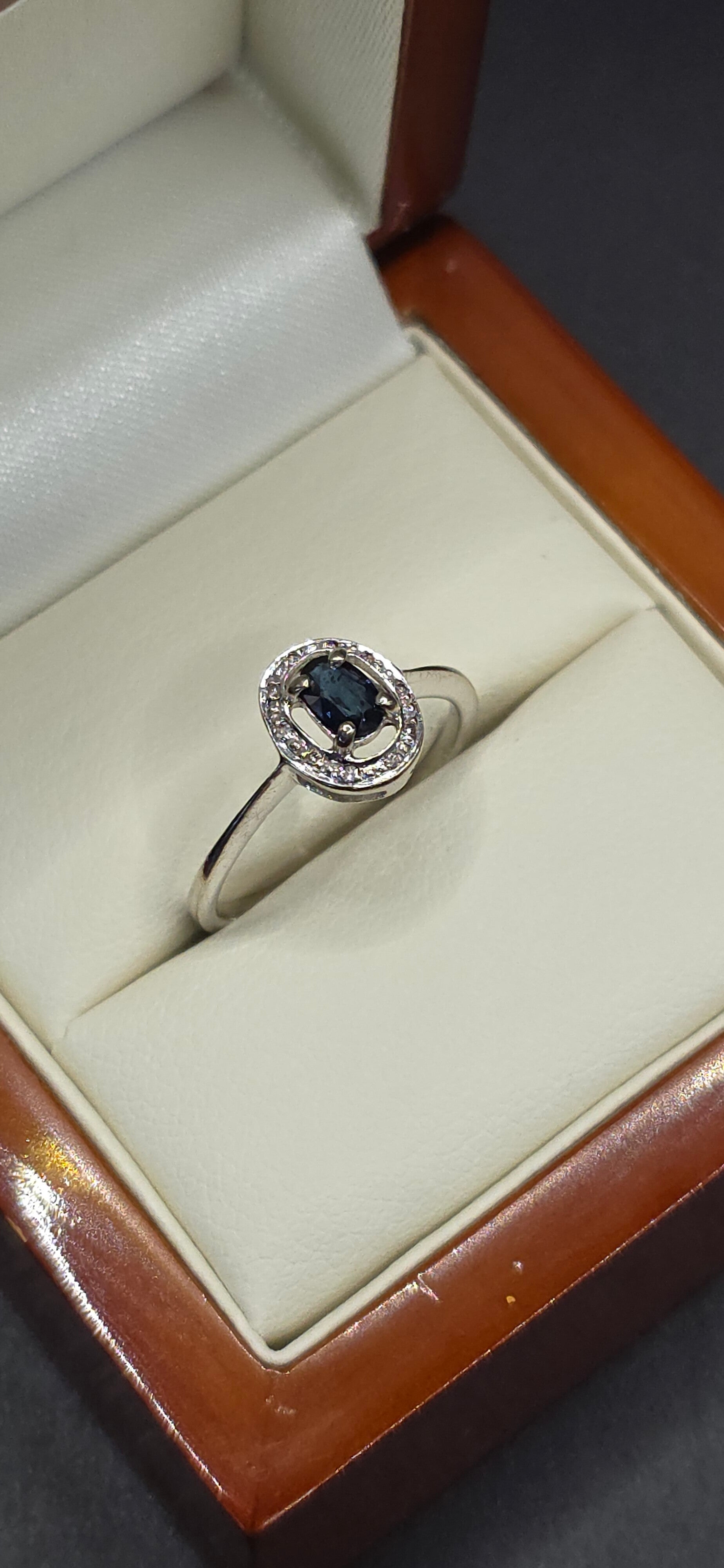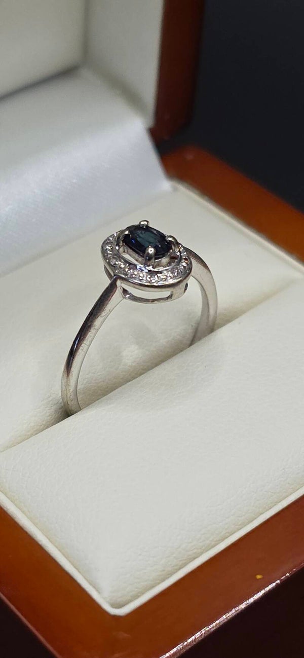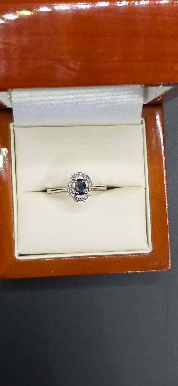 Beautiful Dainty Oval Cut Sapphire and Brilliant Cut Diamonds Set in an Illusion of White Gold.