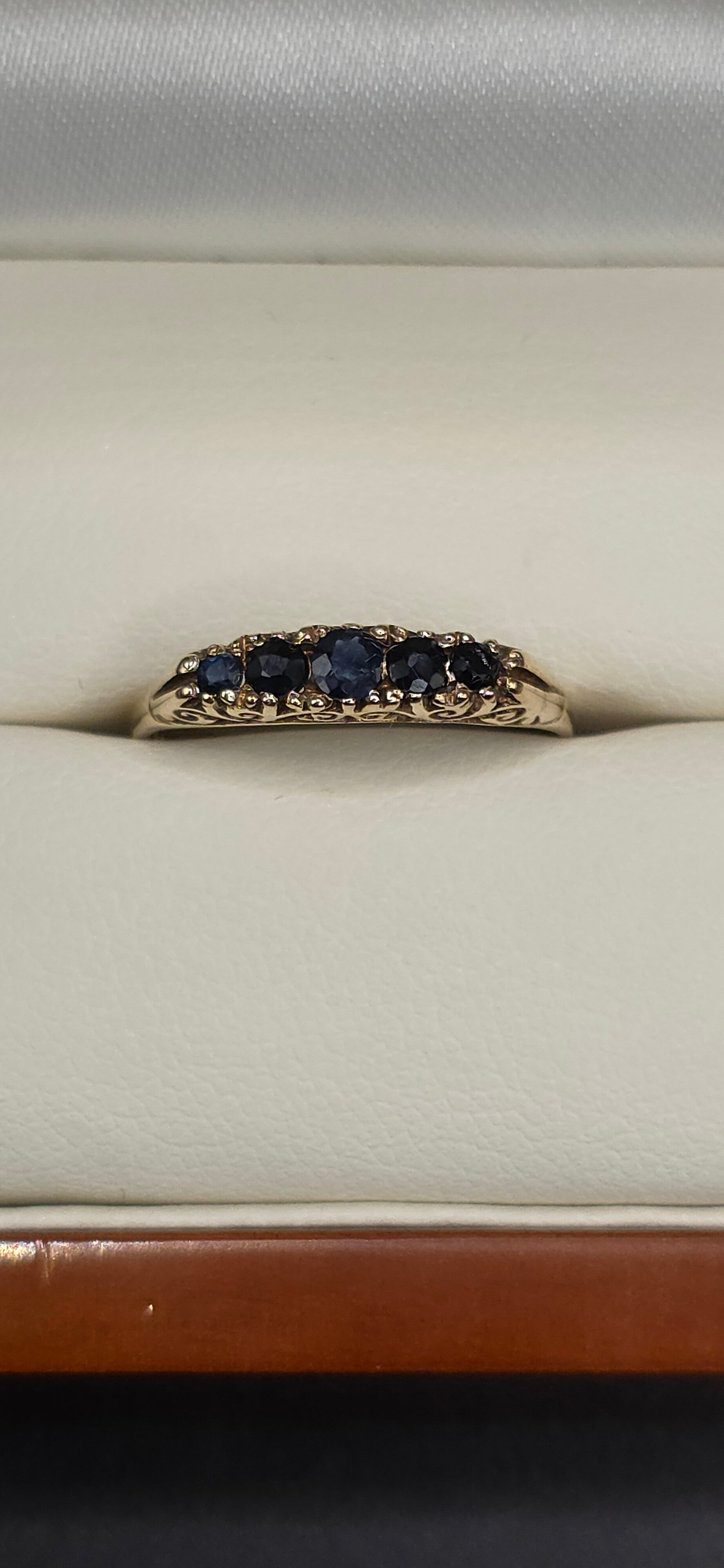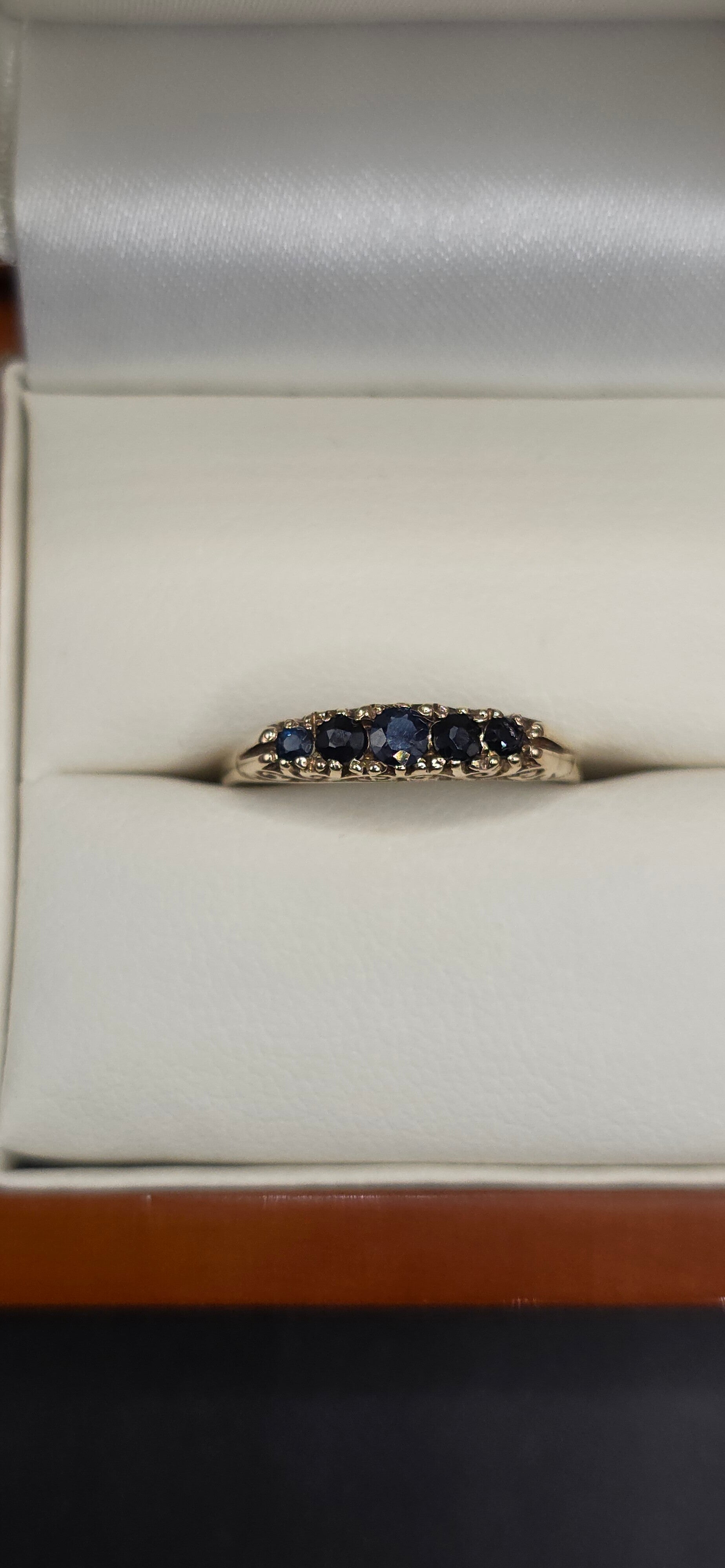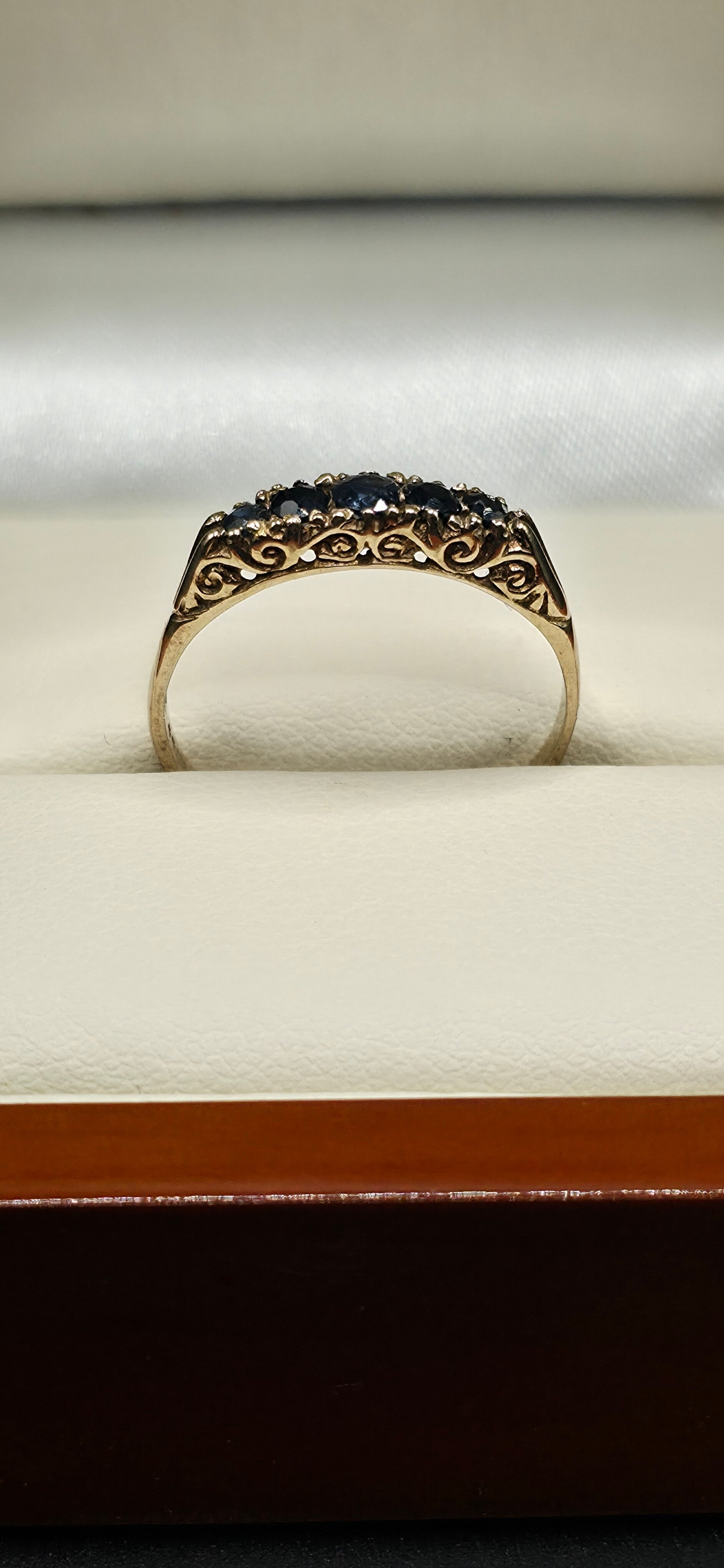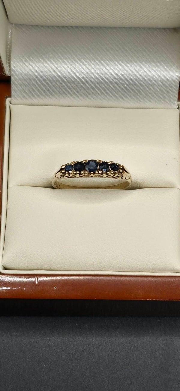 Absolutely stunning 5 beautiful blue Sapphires ascending in Size from the middle. Set in a beautifully carved detailed 9ct Yellow Gold Ring.
