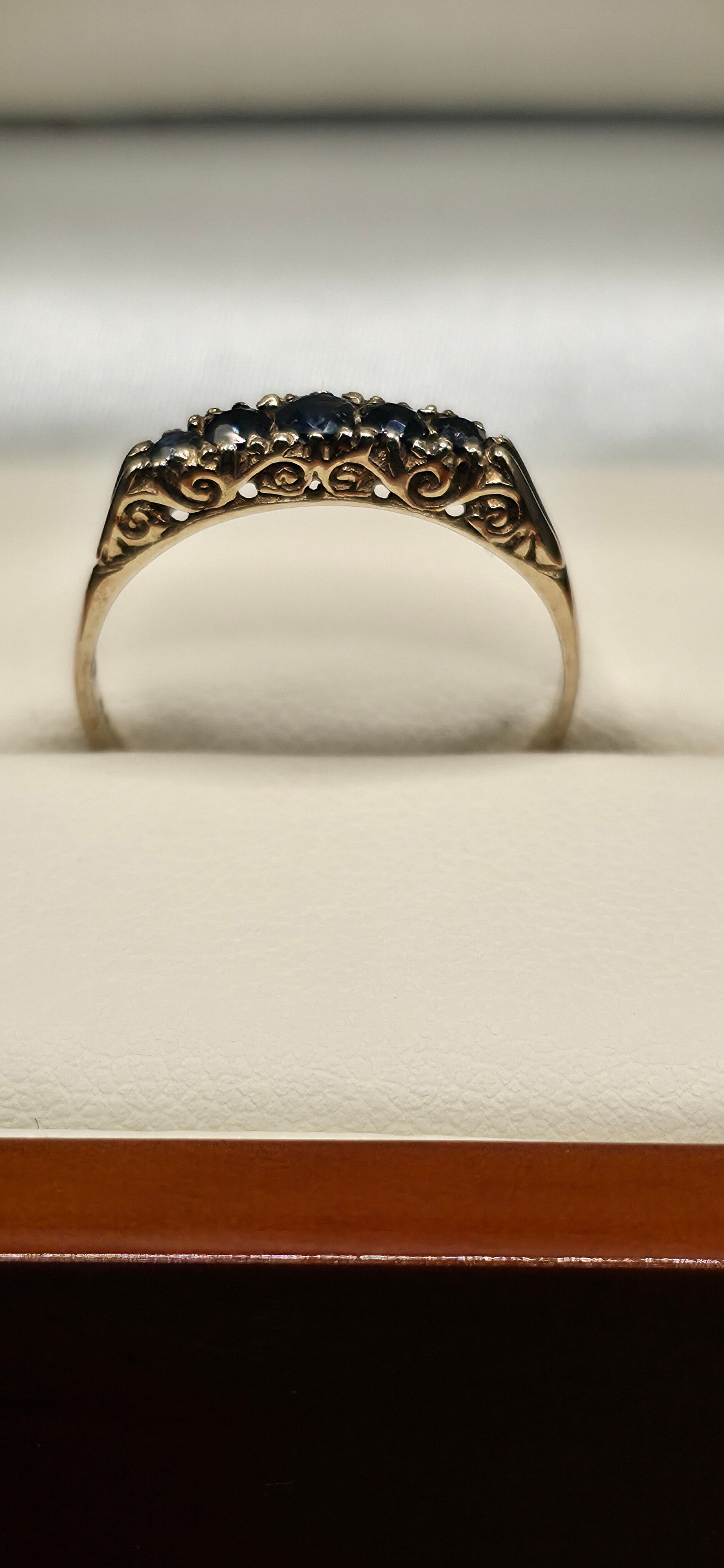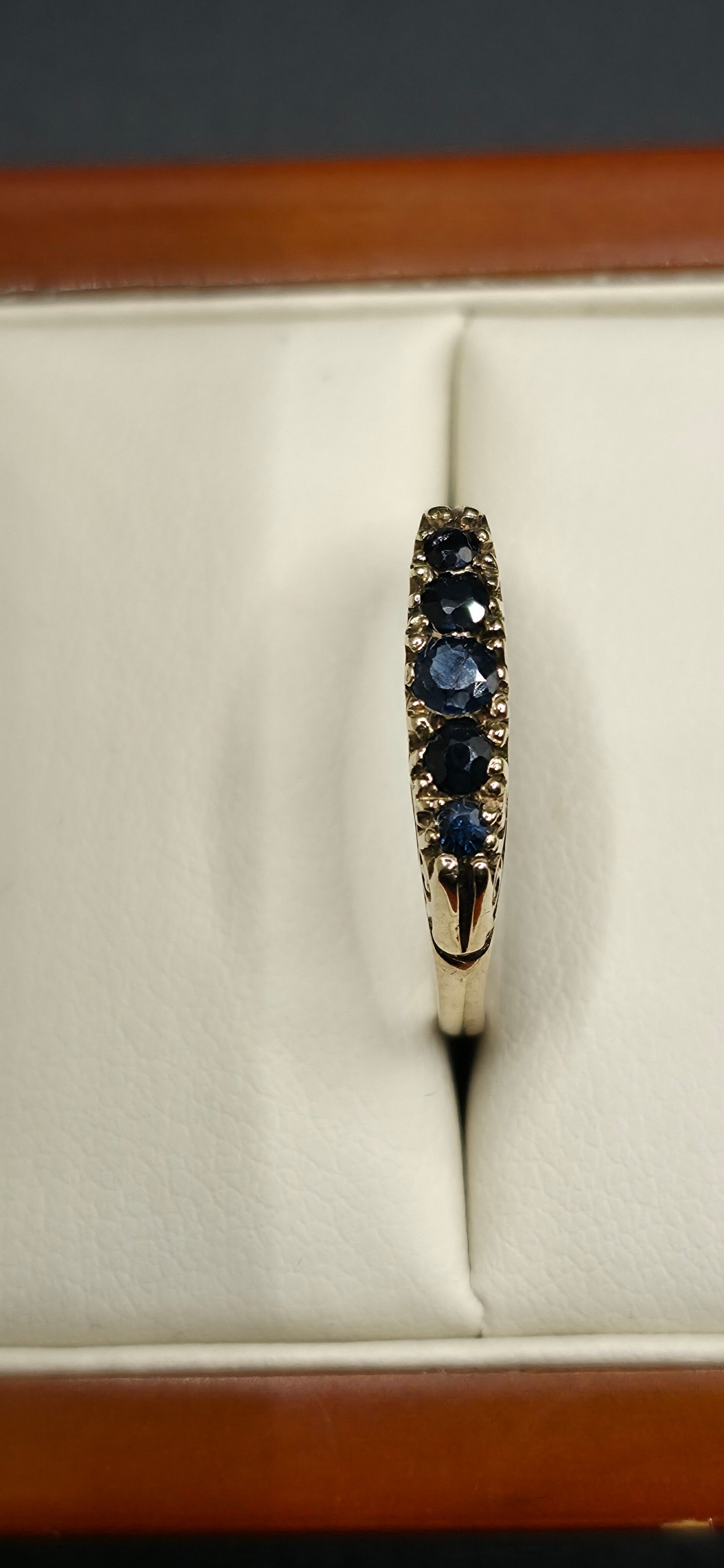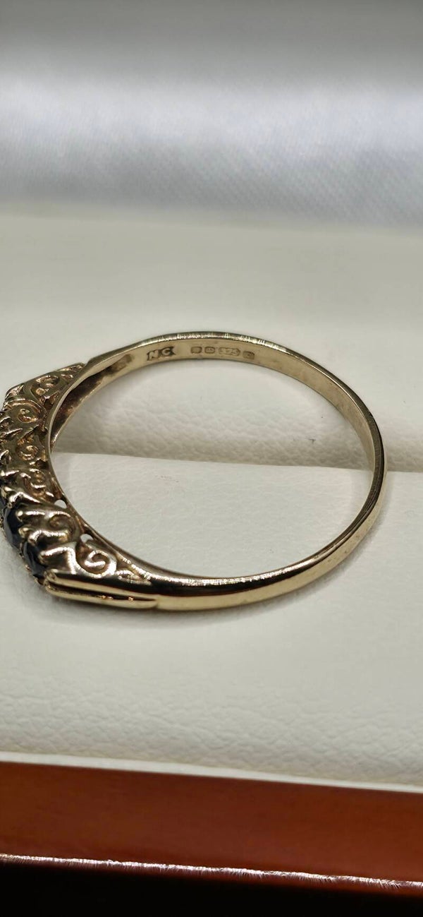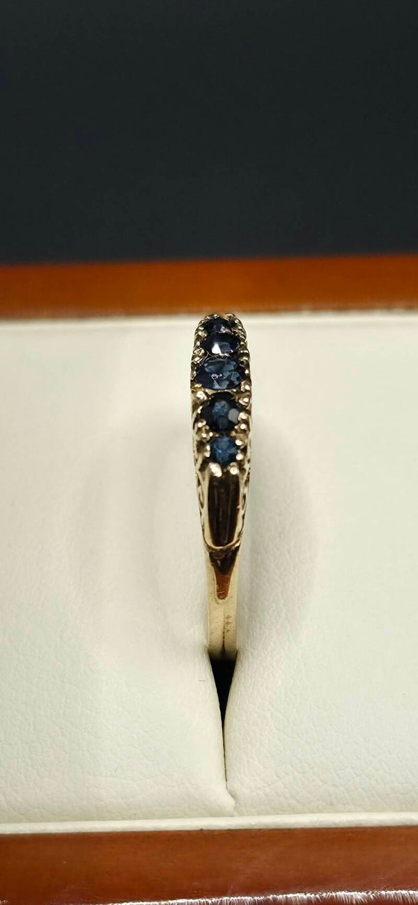 Beautiful Antique Victorian/Edwardian 9ct Yellow Gold five stone Sapphire Half Hoop Ring. Size N